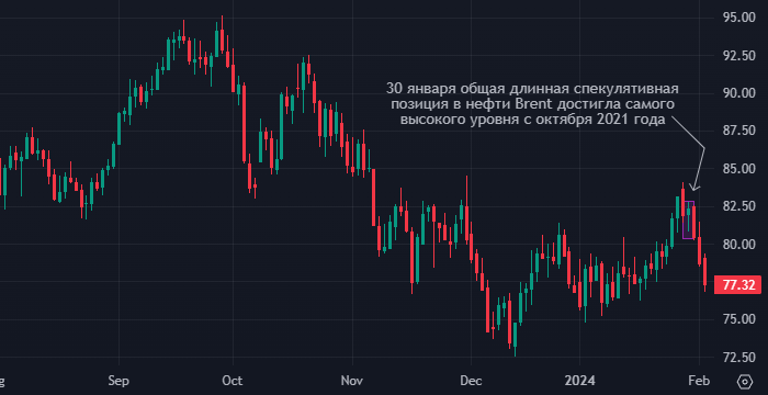 Однако во второй половине текущей недели напряженность в регионе Красного моря несколько снизилась, что оказало значительное давление на биржевые цены на нефть. Это давление было усилено агрессивным бычьим позиционированием крупных спекулянтов, которые были вынуждены продавать. Вследствие этих событий с момента закрытия торговой сессии 30 января наиболее ликвидные — апрельские — фьючерсы на Brent снизились на 6,7%.