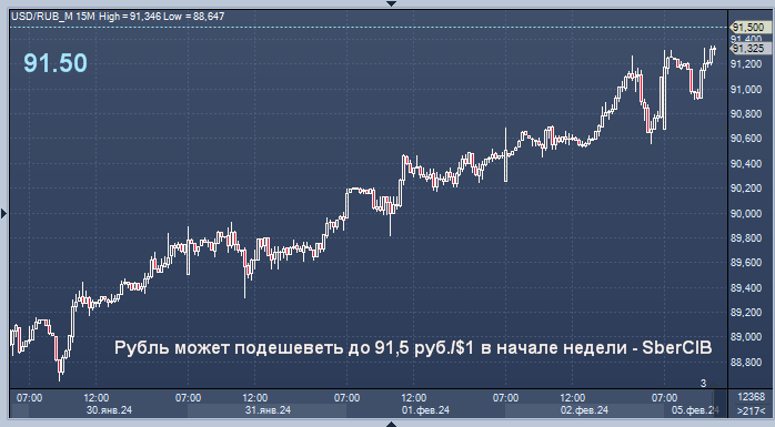 Рубль может подешеветь до 91,5 руб./$1 в начале недели, а нефть марки Brent - подорожать до $78 за баррель, пишут эксперты SberCIB Investment Research. Аналитики отмечают, что в понедельник в центре внимания будет объем операций в рамках бюджетного правила на февраль. Они ожидают, что покупки иностранной валюты в феврале составят около 100 млрд рублей, или 5 млрд рублей в день.