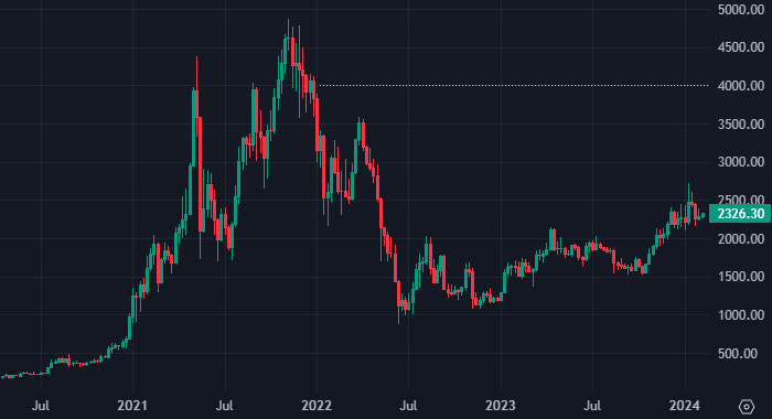 В начале января Standard Chartered прогнозировал, что после того, как SEC одобрит запуск ETF на биткоин, эта криптовалюта со временем вырастет до $200 000. Теперь банк переключает свое внимание на эфир (Ethereum) — вторую по рыночной капитализации криптовалюту — и полагает, что к моменту одобрения запуска аналогичных ETF (ожидается, что это произойдет к 23 мая) она подорожает до $4 000 (+72% с текущих уровней).