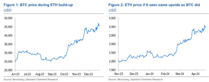 Слева: динамика биткоина накануне одобрения запуска ETF, справа: экстраполяция этой динамики на эфир. Источник: Standard Chartered