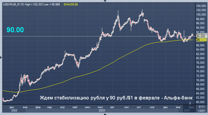 Таким образом, в феврале, как мы и ожидали, объем ежедневной продажи валюты снизился, благодаря чему курс рубля сможет стабилизироваться у отметки примерно 90 руб./$1", - пишет главный экономист Альфа-банка Наталья Орлова.