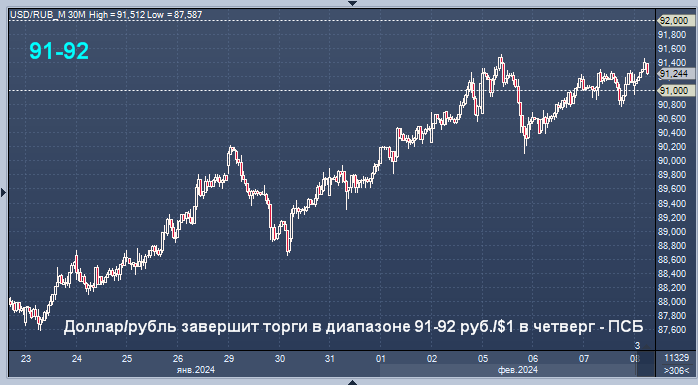 "Курс доллара в среду проторговывал район 91 руб./$1, завершив торговую сессию чуть выше нее и показав символический рост за день ввиду объемных покупок в конце дня. Постепенно восстанавливающаяся нефть (нефть марки Brent смогла вчера вернутьcя выше $79/барр.) и в целом позитивный внешний фон (доллар чуть откатился к ведущим мировым валютам) не оказали поддержку рублю. Утром в четверг доллар остается у 91,3 руб./$1, не демонстрируя заметных движений. Полагаем, что американская валюта может в первой половине дня предпринять новые попытки вернуться "под" 91 руб./$1, но, в отсутствие увеличения предложения валюты со стороны экспортеров, остающегося ключевым фактором поддержки рубля, скорее, и сегодняшние торги завершит в диапазоне 91-92 руб./$1", - полагает начальник отдела экономического и отраслевого анализа Промсвязьбанка (ПСБ) Евгений Локтюхов.