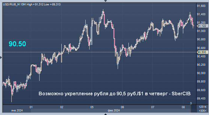 "Рубль в среду торговался около 91 руб./$1, волатильность российской валюты была очень низкой. При этом выросли обороты торгов по паре CNY/RUB, что может говорить о повышении активности экспортеров. Если она останется значительной и в четверг, а высокого спроса на иностранную валюту не будет, рубль может подорожать до 90,5 руб./$1", - пишут эксперты Сбербанка.