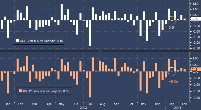 Индекс доллара (DXY), рассчитываемый по отношению к корзине шести основных валют по итогам завершенной торговой недели вырос на 0,15% до 104,8 пункта. Пять из шести недель 2024 г. показатель завершил ростом и только вторую неделю января — нулевым результатом.