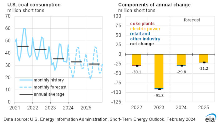 В EIA заявили, что доля природного газа в производстве электроэнергии сохранится на уровне 42% в 2024 году, как и в 2023 году, а затем снизится до 41% в 2025 году. Доля угля снизится с 17% в 2023 году до 15% в 2024 году и 14% в 2025 году, поскольку объем производства возобновляемых источников растет.