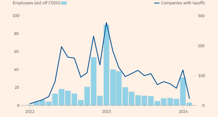 Потери меньше, чем в начале 2023 года, когда крупные технологические группы, включая Amazon и Microsoft, сократили должности, чтобы сгладить последствия чрезмерных инвестиций во время пандемии. В целом в 2023 году в технологическом секторе было сокращено 263 000 рабочих мест.