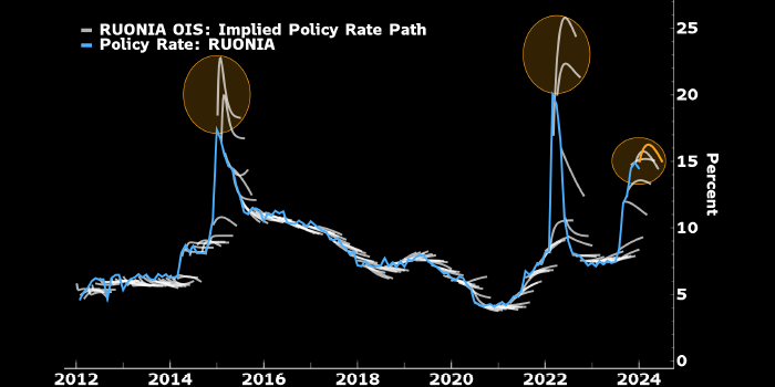 Индикативная ставка по операциям процентный своп на ставку RUONIA (серым (ожидания по ставке)) и сама савка RUONIA (голубым). Источник: Bloomberg