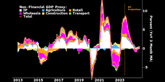 Нефинансовые факторы роста/снижения ВВП РФ в % г/г, среднее трехмесячное значение: белым — промышленное производство, розовым — оптовая торговля, голубым — с/х, желтым — строительство, оранжевым — розничная торговля, салатовым — транспорт. Источник: Bloomberg Economics