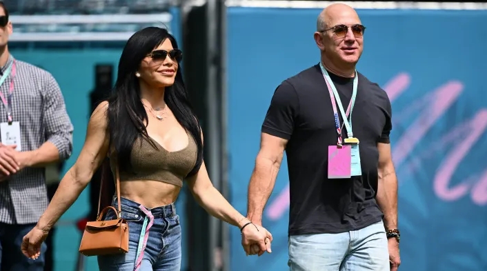 Джефф Безос и Лорен Санчес гуляют в паддоке перед финальной тренировкой перед Гран-при Майами Формулы-1 на Международном автодроме Майами 6 мая 2023 года в Майами, Флорида. (Фото Клайва Мейсона — Формула 1/Формула 1 через Getty Images)