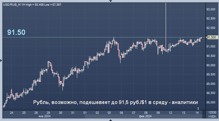 Рубль, возможно, подешевеет до 91,5 руб./$1 по итогам торговой сессии среды, считают аналитики одного крупного банка.