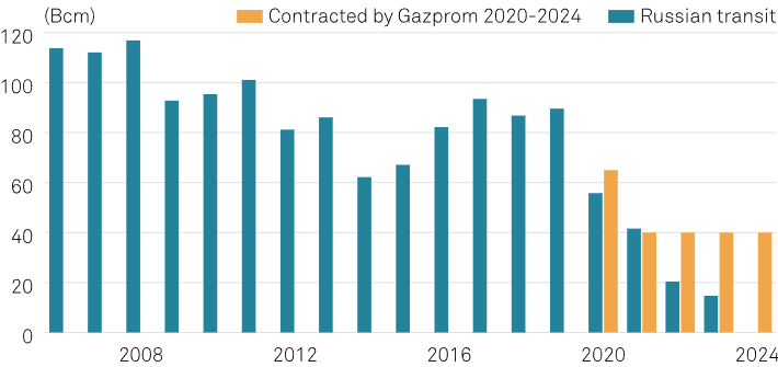 Украинский «Нафтогаз», сетевая компания ГТСУ и «Газпром» подписали в декабре 2019 года пятилетний договор о транзите газа на условиях «поставляй или плати», то есть «Газпром» обязан платить за транзит независимо от того, осуществляет он его или нет. По контракту, в 2024 году «Газпром» должен отправлять в Европу через Украину 110 млн куб. м российского газа в сутки, т. е. в общей сложности отправить 40 млрд куб. м до истечения срока действия контракта.