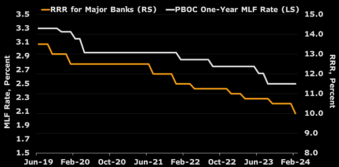 Коэффициент обязательных резервных требований для крупнейших банков Китая (желтым, правая шкала) и базовая процентная ставка по однолетним кредитам (белым, левая шкала). Источник: Bloomberg