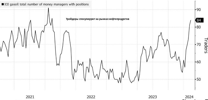 Позиции по контрактам на продукты нефтепереработки обновляют многолетние максимумы. Источник: Bloomberg