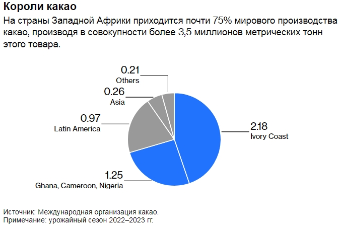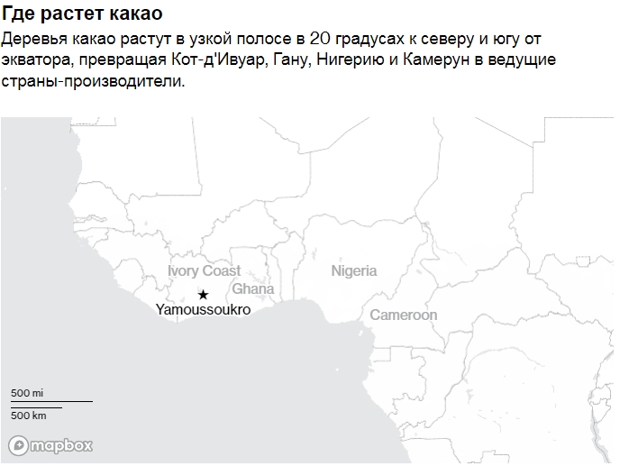 Хотя сегодняшнее затруднительное положение вполне может привести к взвинчиванию цен и сокращению инфляции в конце цепочки поставок, причина кризиса находится в начале цепочки в Западной Африке. Там четыре страны — Кот-д'Ивуар, Гана, Камерун и Нигерия — производят почти 75% мирового какао. Королем является Кот-д'Ивуар, который в обычный год производит 2 миллиона тонн – по сравнению с мировым потреблением в 5 миллионов тонн.