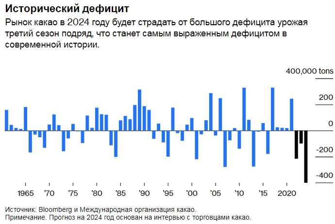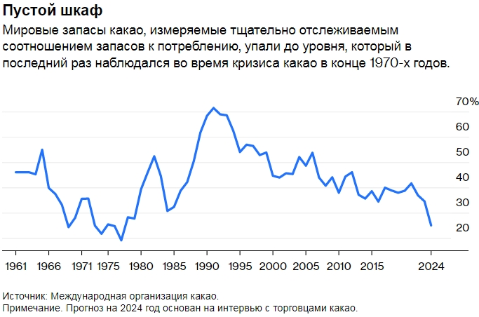 Сегодня этот урожай по-прежнему выращивают преимущественно бедные мелкие землевладельцы. Зарабатывая достаточно, чтобы выжить, большинству из них не хватает средств для реинвестирования в свои участки. И, наконец, десятилетия недостаточного инвестирования догнал растущий спрос на шоколад. Третий сезон урожая подряд мировое потребление в 2023-2024 годах будет значительно превосходить производство – нечто невиданное с начала 1960-х годов.