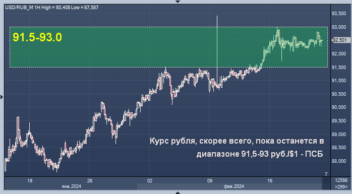 Валютная пара доллар/рубль, скорее всего, пока будет торговаться в диапазоне 91,5-93 руб./$1, считает начальник отдела экономического и отраслевого анализа Промсвязьбанка (ПСБ) Евгений Локтюхов.