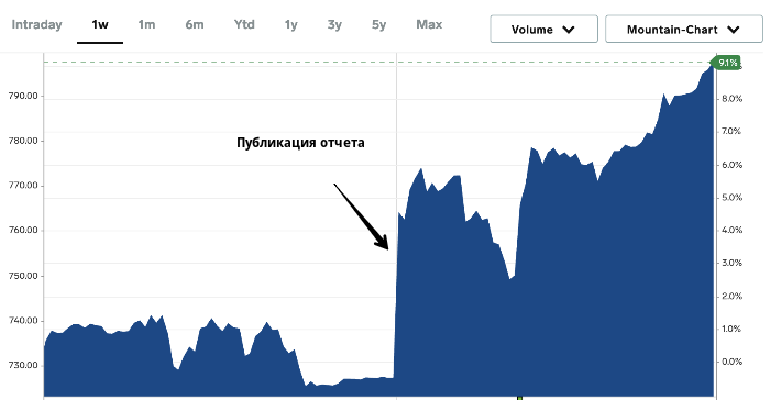 Акции компании подскочили на 16% и обновили рекордный максимум на уровне $781.54. Такой рост за один день прибавил $267 млрд к рыночной капитализации компании. Это больше рыночной стоимости Netflix, которая в четверг достигла $254 млрд.