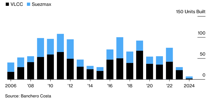 Оживлению способствует исторически низкий портфель заказов. После двух супертанкеров, которые пополнят флот в этом году, в 2025 году их будет всего пять, согласно данным Banchero Costa. Для сравнения: в 2022 году на воду спустили 42 судна. Хотя в последнее время наблюдается рост заказов, на их получение уходят годы: в настоящее время верфи заполнены контейнеровозами, которые были заказаны во время пандемии, а также запросами на перевозку сжиженного природного газа.