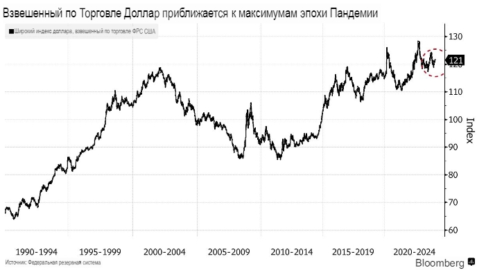 Доллар сейчас чуть-чуть не дотягивает до рекорда, достигнутого во время пандемии, и находится на пороге лучшего года с 2020 года. По отношению к валютам крупнейших торговых партнеров Америки его курс на 17 % выше среднего значения за последние два десятилетия.