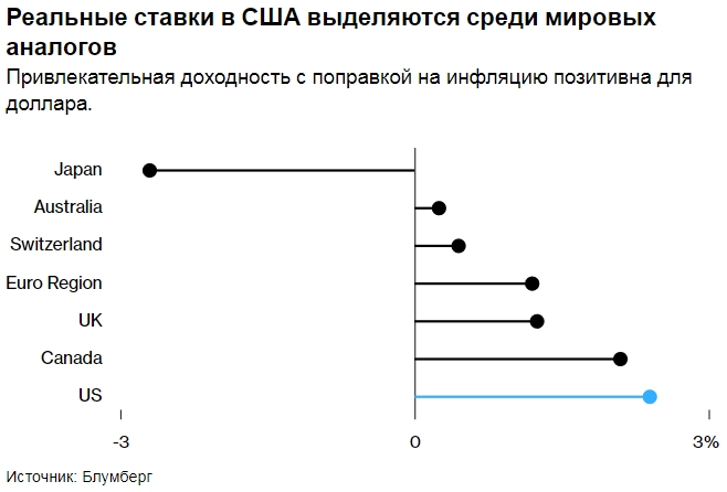 Перспективы высоких доходов от американских активов поддерживают доллар и "оказываются труднопреодолимой планкой", - написала группа валютных стратегов Goldman Sachs во главе с Камакшией Триведи в недавней записке для клиентов, хотя они добавили, что доллар уже достиг или "превысил" ближайшие прогнозы компании.