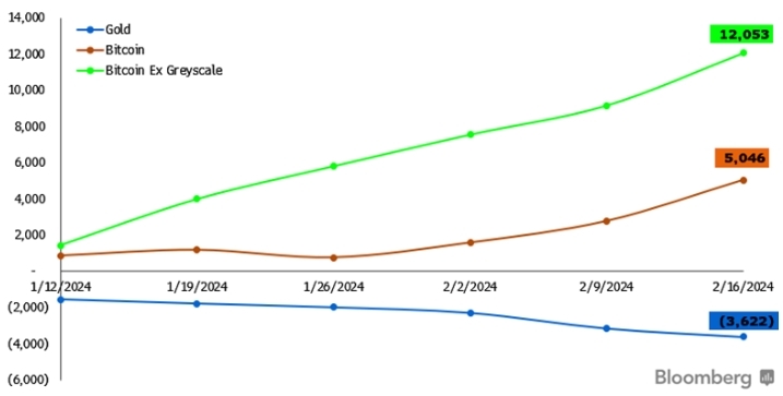 Меж тем обеспеченные золотом ETF получили за тот же период отток средств в размере 3,6 миллиарда долларов. Вероятно, небольшая часть средств, которая ушла из «золотых» ETF, пришла в биткоин-ETF, сам факт появления биткоин-ETF и их успешный запуск с точки зрения интереса инвесторов, оказал негативное влияние на инвестиции в золото, считают эксперты Bloomberg Intelligence.