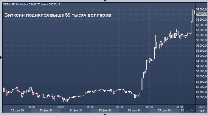 Биткоин поднялся выше уровня в 59 000 долларов в утренние часы в Европе в среду, прибавив 5% за последние 24 часа и достигнув рыночной капитализации в 1,2 триллиона долларов.