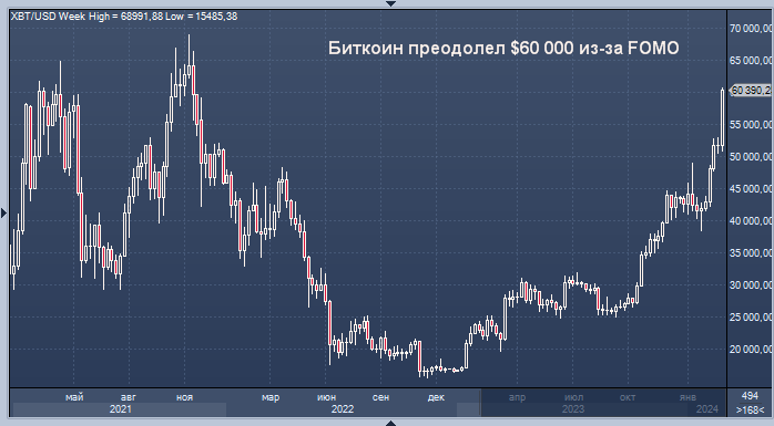 Крупнейшая криптовалюта подскочила отчасти благодаря успешному запуску американских биржевых фондов, владеющих монетами, которые привлекли более 6 миллиардов долларов с момента начала торгов 11 января. Последний раз биткойн торговался по цене 60 000 долларов США в ноябре 2021 года, после достижения рекордного максимума в почти 69 000 долларов ранее в том же месяце.