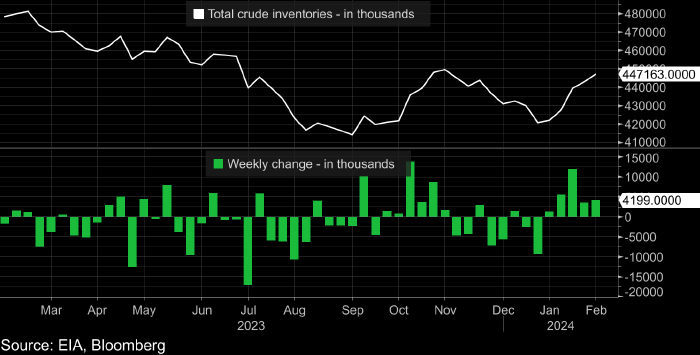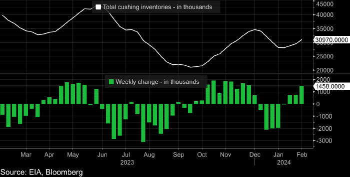 Запасы нефти в Кушинге выросли на 1,5 млн баррелей до самого высокого уровня с 12 января.