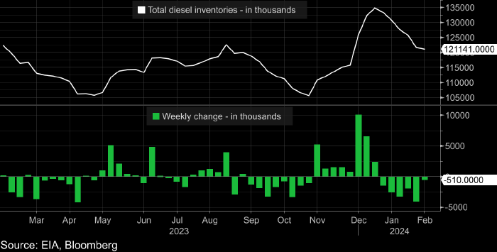 Запасы дизеля снизились на 0,5 млн баррелей (шестое снижение подряд) до самого низкого уровня с 22 декабря.