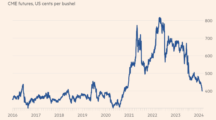 Цены на кукурузу падают с 2022 года. Источник: The Financial Times