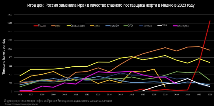 В 2023 году Россия стала главным поставщиком нефти в Индию. В рамках срочных сделок и закупок на спотовом рынке южноазиатская страна импортировала около 1,66 млн баррелей в день российской нефти в 2023 году по сравнению с 652 000 баррелей в день в среднем в 2022 году.