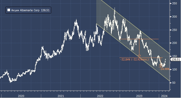 До недавнего времени американский литиевый гигант Albemarle был на подъеме, реализуя агрессивные планы расширения. Однако акции компании подешевели на 33% в 2023 г. и с начала 2024 г. по состоянию на середину февраля падали еще на 25% (хотя восстановили потери во второй половине месяца, при этом цена акций остается вблизи 3-летнего минимума).