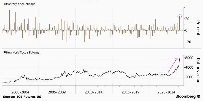 Фьючерсы на какао в Нью-Йорке показали самый большой месячный рост (в процентах) более чем за два десятилетия на фоне растущих опасений по поводу дефицита предложения, которые угрожают еще больше поднять цены на ключевой ингредиент в производстве шоколада.
