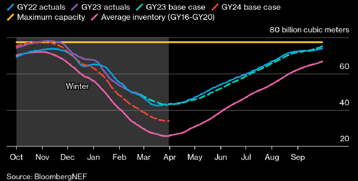 После окончания текущего отопительного сезона хранилища природного газа в «Европейском периметре» — Северо-западный регион, Италия и Австрия — все еще будут заполнены больше, чем наполовину, прогнозирует BloombergNEF. По оценкам аналитиков компании, сохраняющийся подавленный спрос на голубое топливо вкупе с высоким предложением позволят Европе заполнить хранилища под завязку к ноябрю.