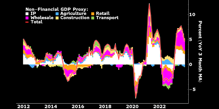 Вклад нефинансовых секторов в ВВП РФ (в % г/г, среднее трехмесячное значение): белым — промпроизводство, голубым — с/х, оранжевым — розничная торговля, фиолетовым — оптовая торговля, желтым — строительство, салатовым — транспорт, красным — совокупный показатель. Источник: Bloomberg