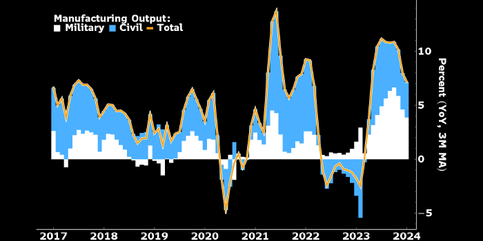 Производство в обрабатывающей промышленности РФ: белым — оборонка, голубым — гражданское производство, оранжевым — совокупный показатель. Источник: Bloomberg