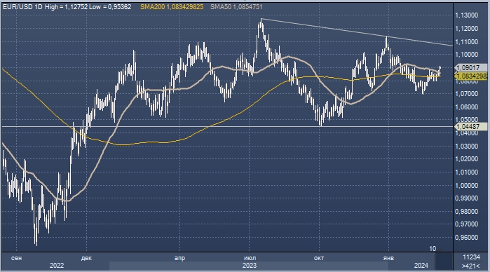 Согласно прогнозам, евро, который за год упал примерно на 1,5%, вырастет на 3,0% и будет торговаться около $1,12 по итогам года. Евро/доллар торгуется в моменте около $1,09.