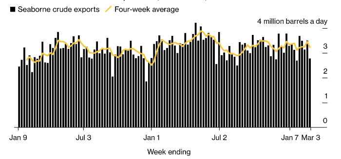 Валовая стоимость российского экспорта сырой нефти упала до пятинедельного минимума: за семь дней по 3 марта она снизилась до $1,37 млрд с $1,73 млрд на предыдущей неделе. При этом средний доход за четыре недели также резко снизился — на $110 млн до $1,58 млрд в неделю.