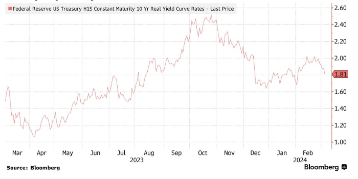 Основным фактором роста цен на золото в прошлом году были прогнозы по ставкам ФРС. Рынок ждал, когда ЦБ начнет снижать стоимость заимствований. Рынки свопов показывают, что вероятность снижения ставки в июне составляет 65%, по сравнению с 58% в конце февраля. В среду председатель ФРС Джером Пауэлл вновь заявил законодателям, что центральный банк США не спешит снижать процентные ставки, политики хотят убедиться, что выиграли борьбу с инфляцией. Когда ФРС, в конце концов, перейдет к смягчению политики, альтернативные издержки, связанные владением золотом, снизятся. Реальная доходность в США сокращается с октября прошлого года, но недавний скачок цен на золото значительно превзошел все ожидания.