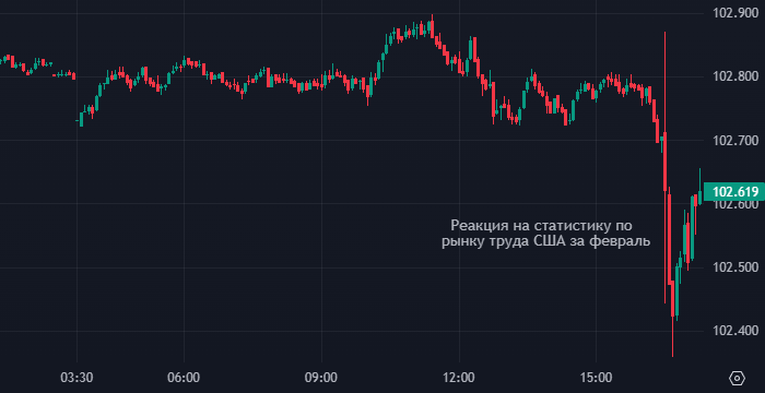 Во второй половине торгов пятницы Индекс доллара DXY опустился до самого низкого значения с 15 января после публикации статистики по рынку труда США за февраль.