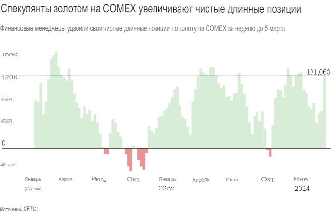 Спекулянты на COMEX увеличили свои чистые длинные позиции на 63 018 контрактов до 131 060 на неделе, закончившейся 5 марта, показали данные в пятницу.