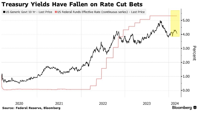 Доходность казначейских облигаций упала из-за ожиданий снижения ставок. Последняя цена правительственных 10-летних облигаций США, эффективная ставка по федеральным фондам США