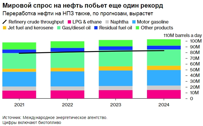В целом, мировые мощности по переработке сырой нефти, согласно прогнозам, вырастут более чем на 1,5 миллиона баррелей в день в этом году, немного опережая рост спроса на 1,4 миллиона, хотя прогнозы различаются в зависимости от топлива, сказал Джордж Дикс, аналитик по нефтепереработке консалтинговой компании Energy Aspects Ltd.