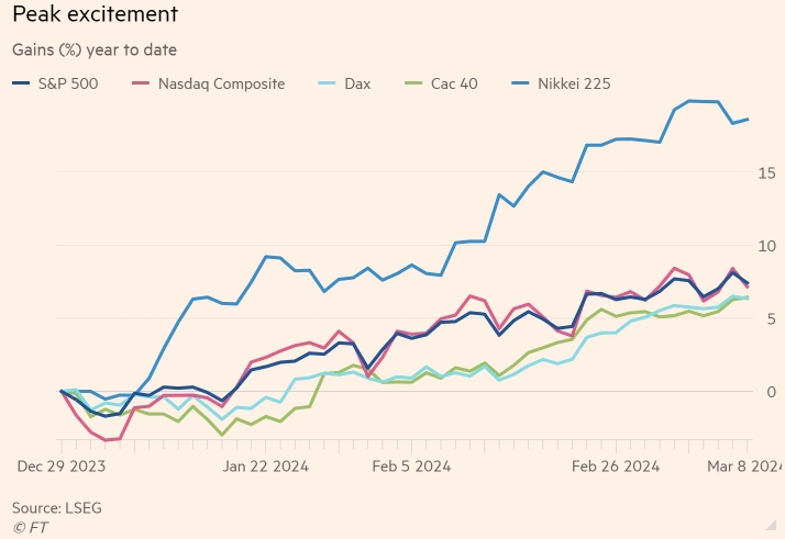 Пик воодушевления. Рост (%) с начала года. Индекс S&P 500, Композитный индекс Nasdaq, немецкий Dax, французский Cac 40 и японский Nikkei 225. Источник: LSEG © FT