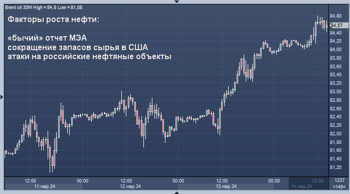 В среду котировки Brent впервые с ноября закрылись выше 84 долларов за баррель после того, как оба контракта продемонстрировали почти 3-процентный дневной прирост на фоне повышения прогноза спроса в США и усиления геополитических рисков.