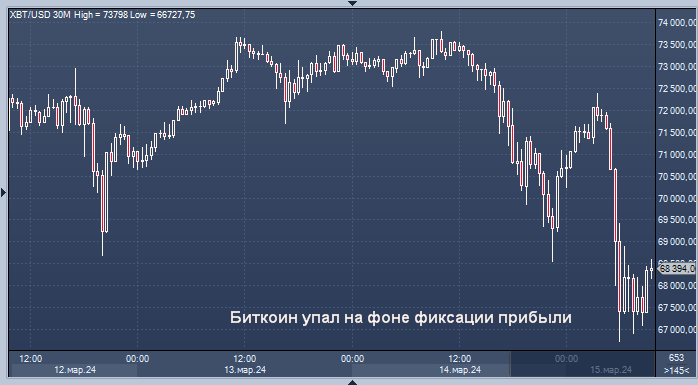 Неровные движения крупнейшей в мире криптовалюты произошли через день после того, как ее курс достиг максимума в $73 803,25, установив новый рекорд четвертый день подряд.