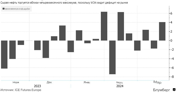 Нефть торгуется около четырехмесячного максимума после того, как Международное энергетическое агентство спрогнозировало дефицит предложения до конца 2024 года, изменив свой предыдущий прогноз профицита, при условии, что ОПЕК+ сохранит сокращение добычи.