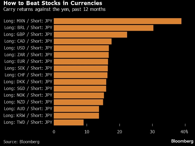 Как превзойти прибыль от инвестирования в акции, вкладывая в валюту. Доходность кэрри-трейда (Carry) по отношению к иене за последние 12 месяцев. Источник: Блумберг