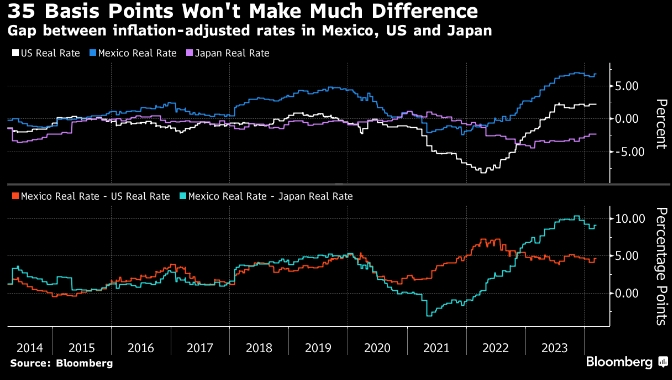 35 базисных пунктов не будут иметь большого значения. Разрыв между ставками с поправкой на инфляцию в Мексике, США и Японии. Реальная ставка в США, Мексике и Японии.