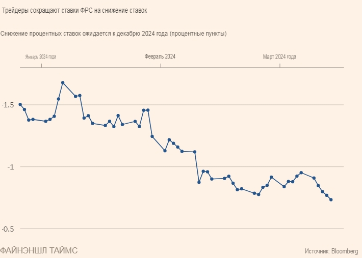 Согласно данным, собранным LSEG, после ряда экономических данных, сигнализирующих о том, что инфляция в США остается стабильно высокой, трейдеры в пятницу прогнозировали снижение ставок всего на три четверти пункта к концу года.